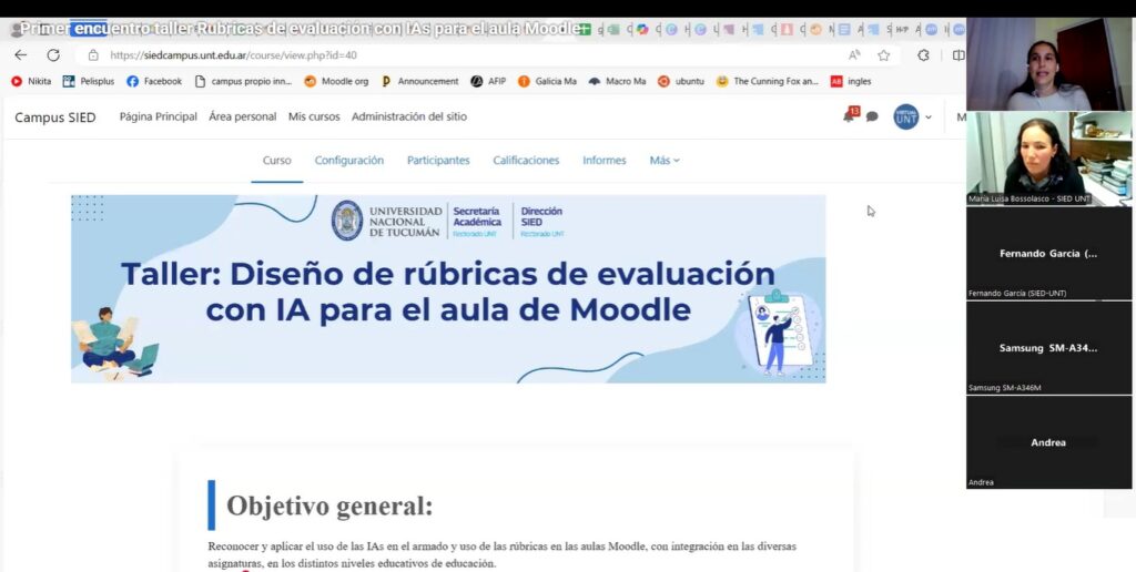 Esta actividad de capacitación, organizada por la Secretaría Académica a través del SIED, se centró en la innovación pedagógica y el fortalecimiento del desarrollo de la enseñanza y la evaluación en entornos virtuales. El impacto social se manifiesta al dotar a los docentes de la UNT de herramientas para el uso de la Inteligencia Artificial en la creación de rúbricas aplicadas al aula Moodle. El taller tuvo una duración de dos semanas, se dictó de forma virtual y registró una participación de 70 docentes, impulsando la adaptación de la docencia a las nuevas tecnologías educativas.